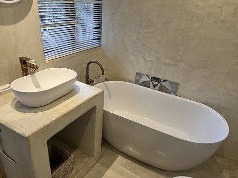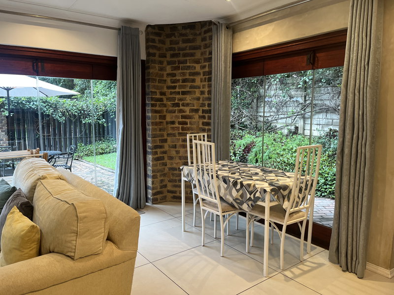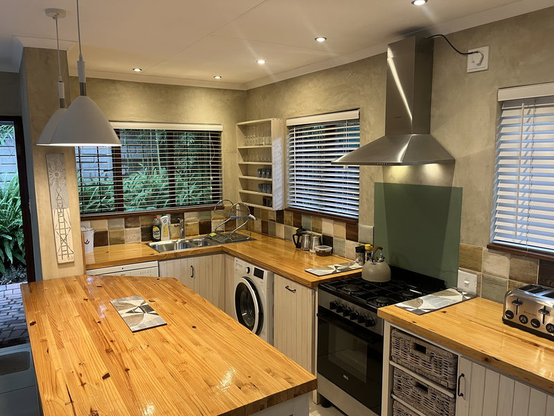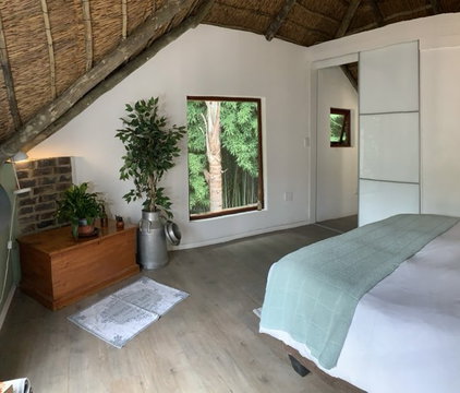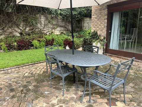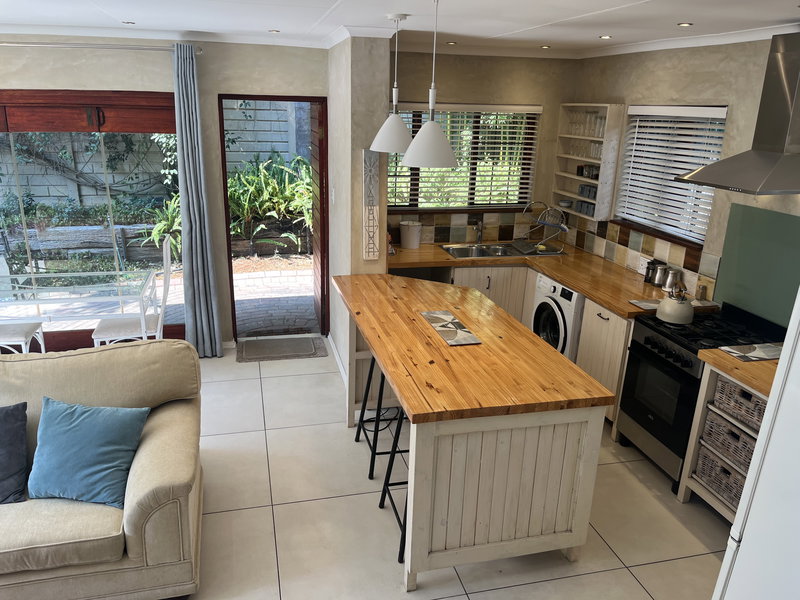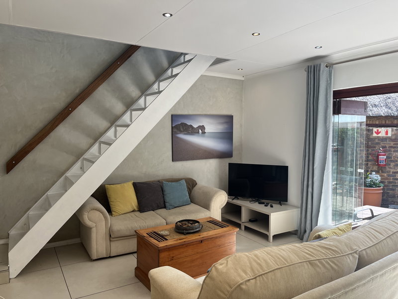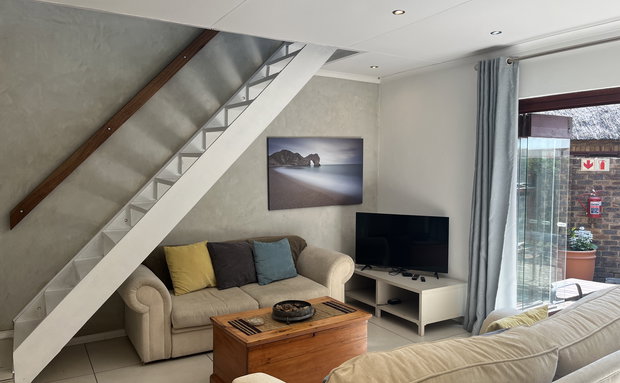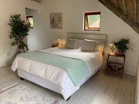 This delightful thatched duplex townhouse is privately set apart on a working guesthouse property. It's ideal for a professional couple who want a home from home short or long term place to work and travel from. It has its own private entrance and garden, comes fully furnished, with a delightful living/dining kitchen downstairs and two bedrooms, both en suite upstairs. Security is good with double gates, alarm, armed response, cameras and electric fencing. We have our own borehole so water is never a problem. Solar and an invertor prides back energy. Guests are welcome to enjoy the guesthouse garden, pool and braai facilities. The Townhouse is serviced once a week but additional cleaning can be arranged. Highspeed fibre wiFi is provided with Netflx and Utube connectivity.